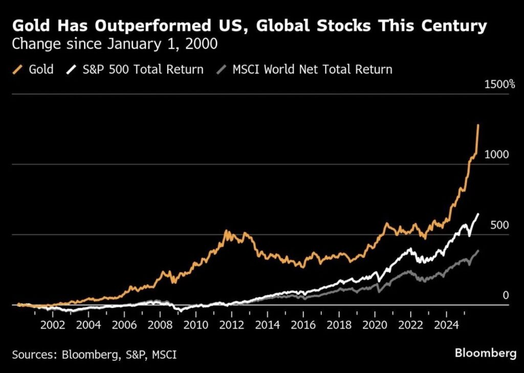 Gold has doubled from $2,000 to $4,059 in just two years, outperforming equities with a 1,200% return since 2000. Demand is rising as U.S. debt concerns and monetary easing drive safe-haven flows.